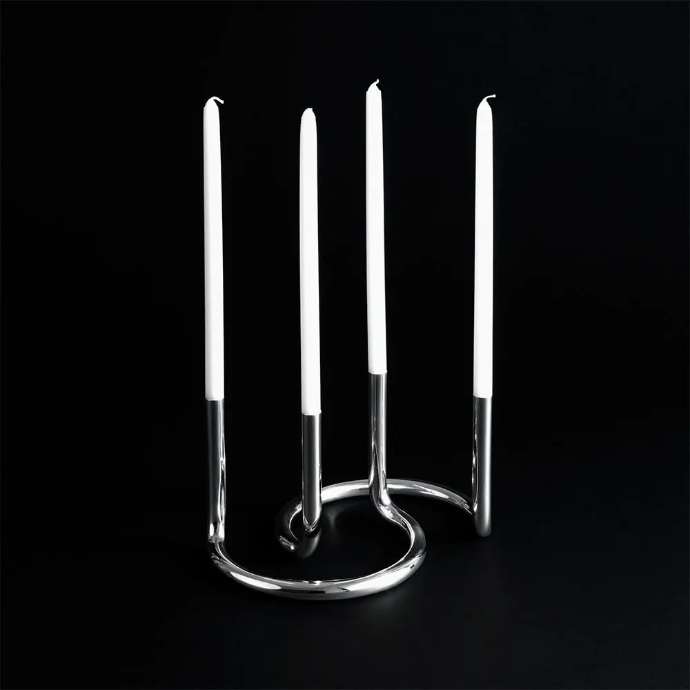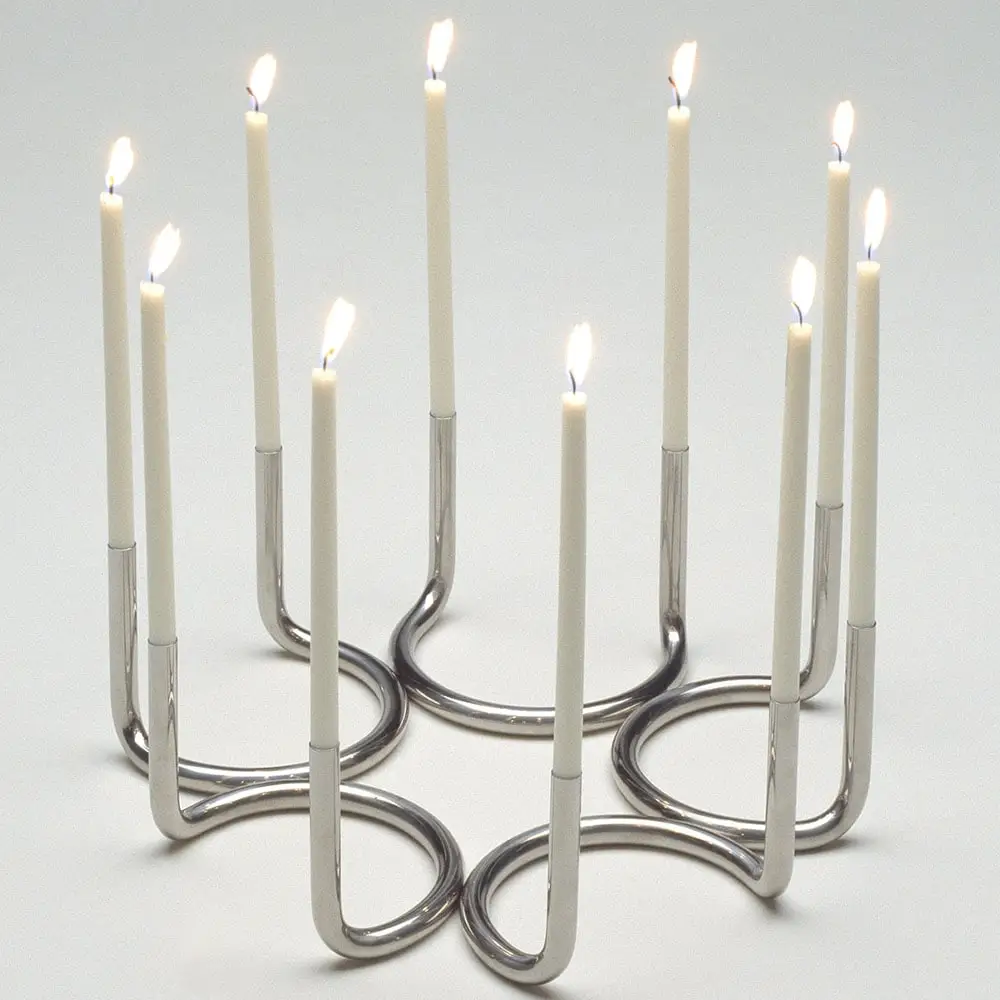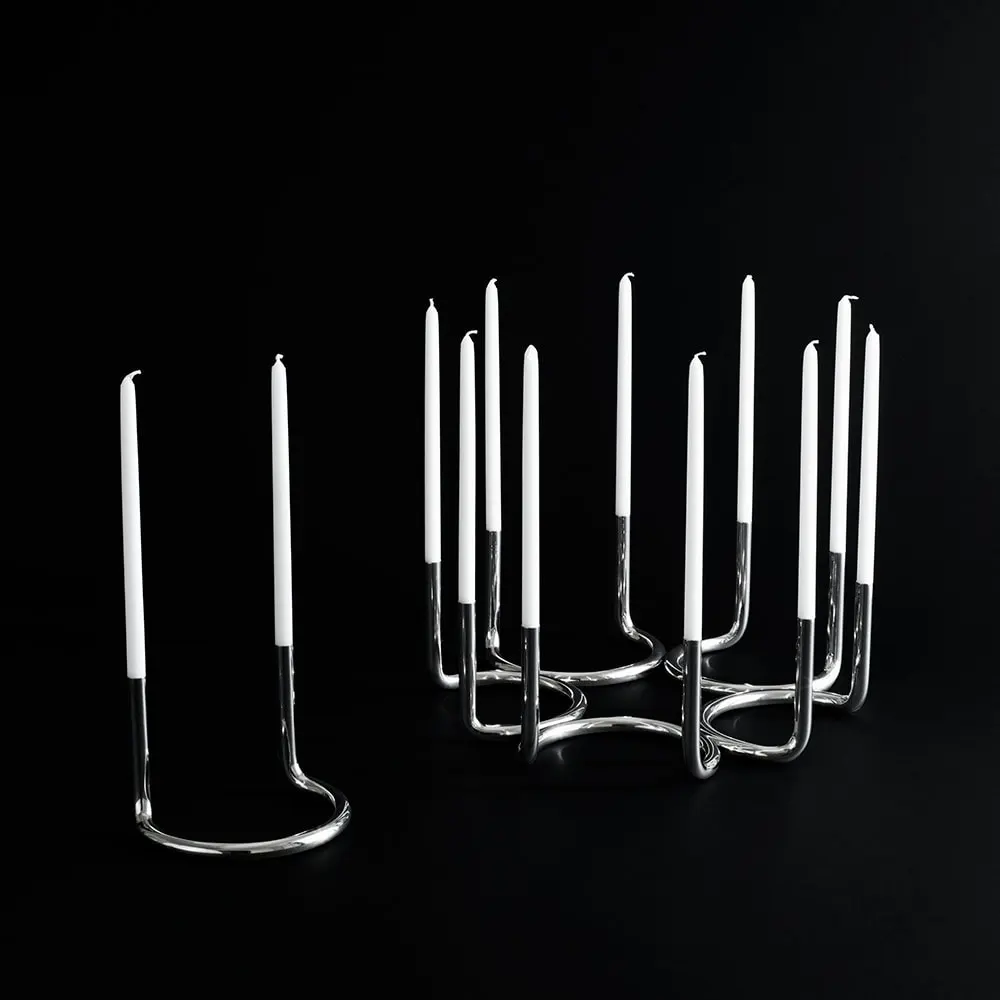 Peter Karpfs Gemini is a candle holder for two candles and made of stainless steel. Gemini can be combined and placed in a multitude of variations.