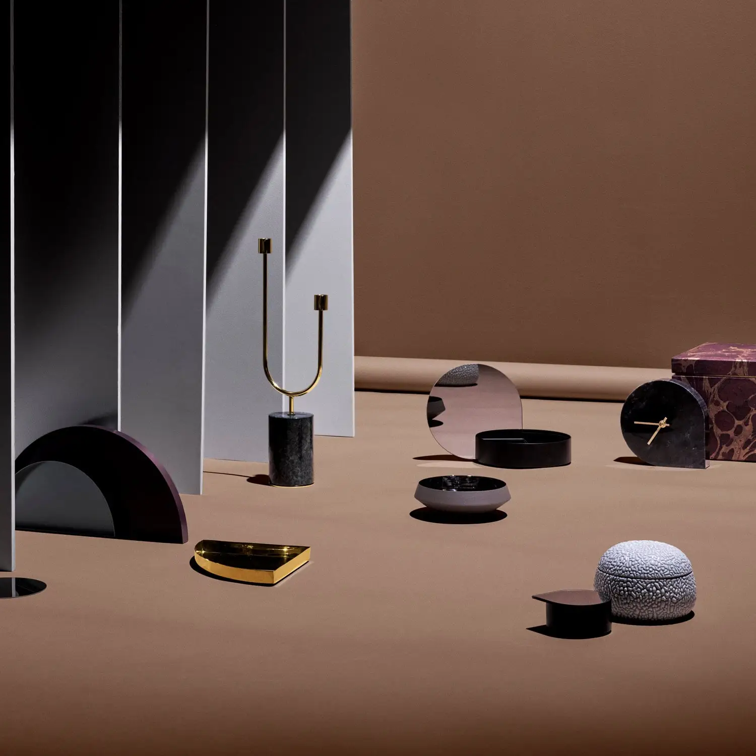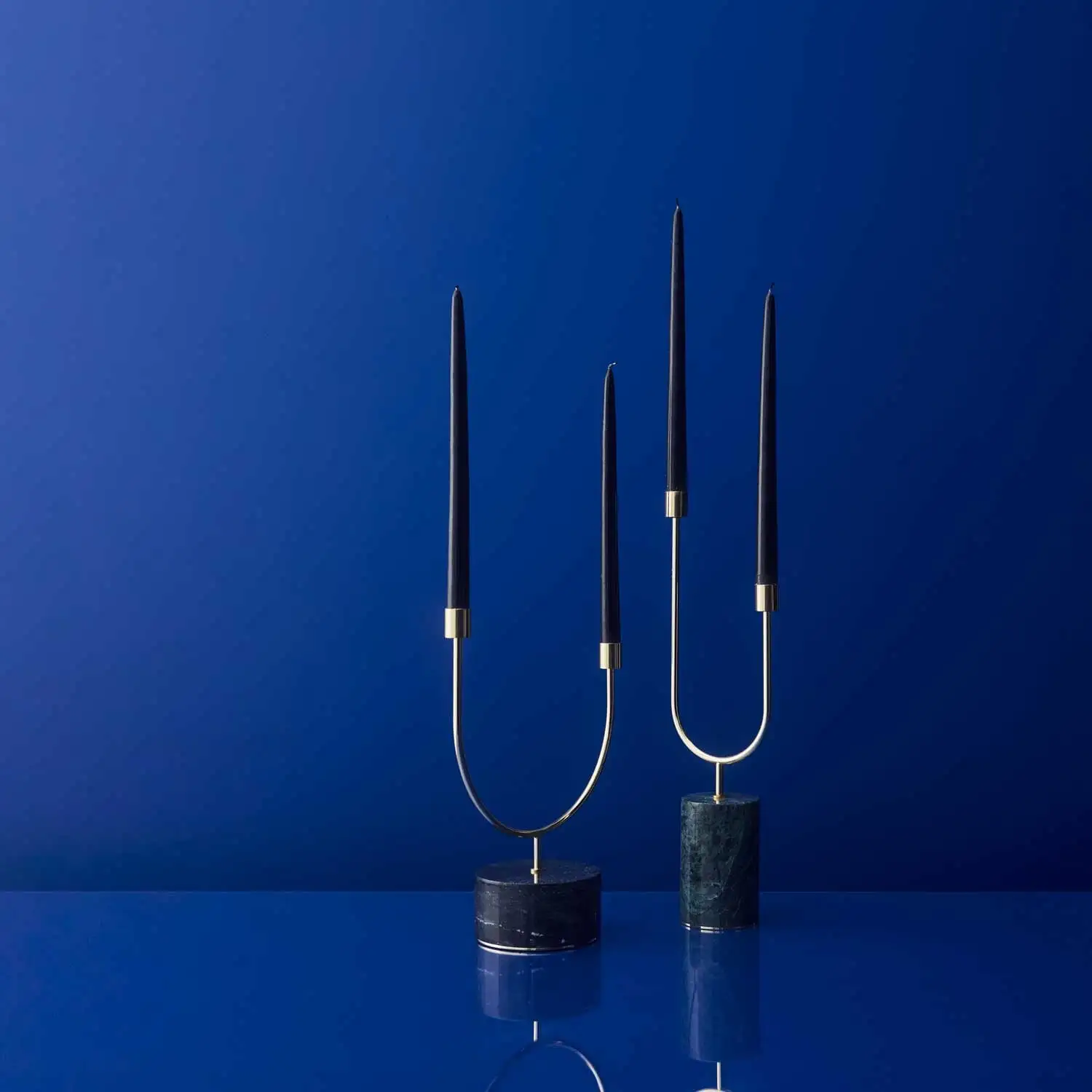 Grasil is a majestic candle holder from Danish AYTM. With a heavy base of green marble and stately candle holders in brass plated iron, this candle holder becomes a centerpiece of the room. With candles, it is around half a meter high. Grasil is also available in a lower wider variant with a black foot.