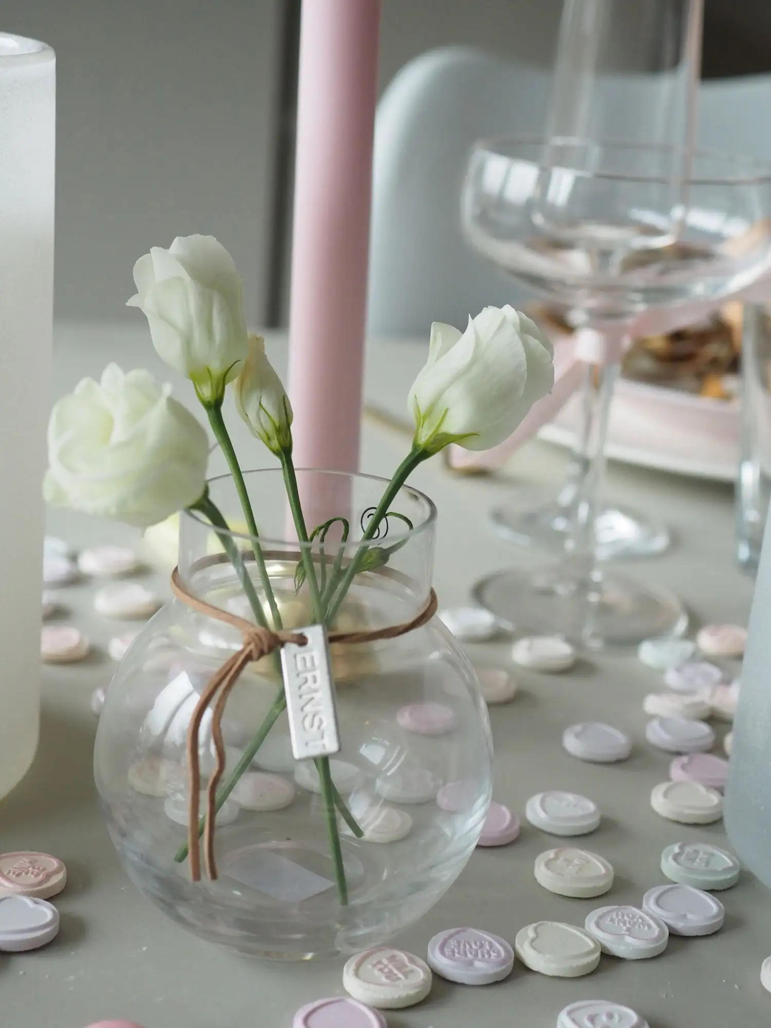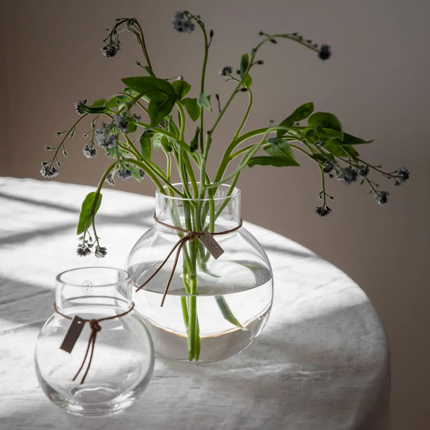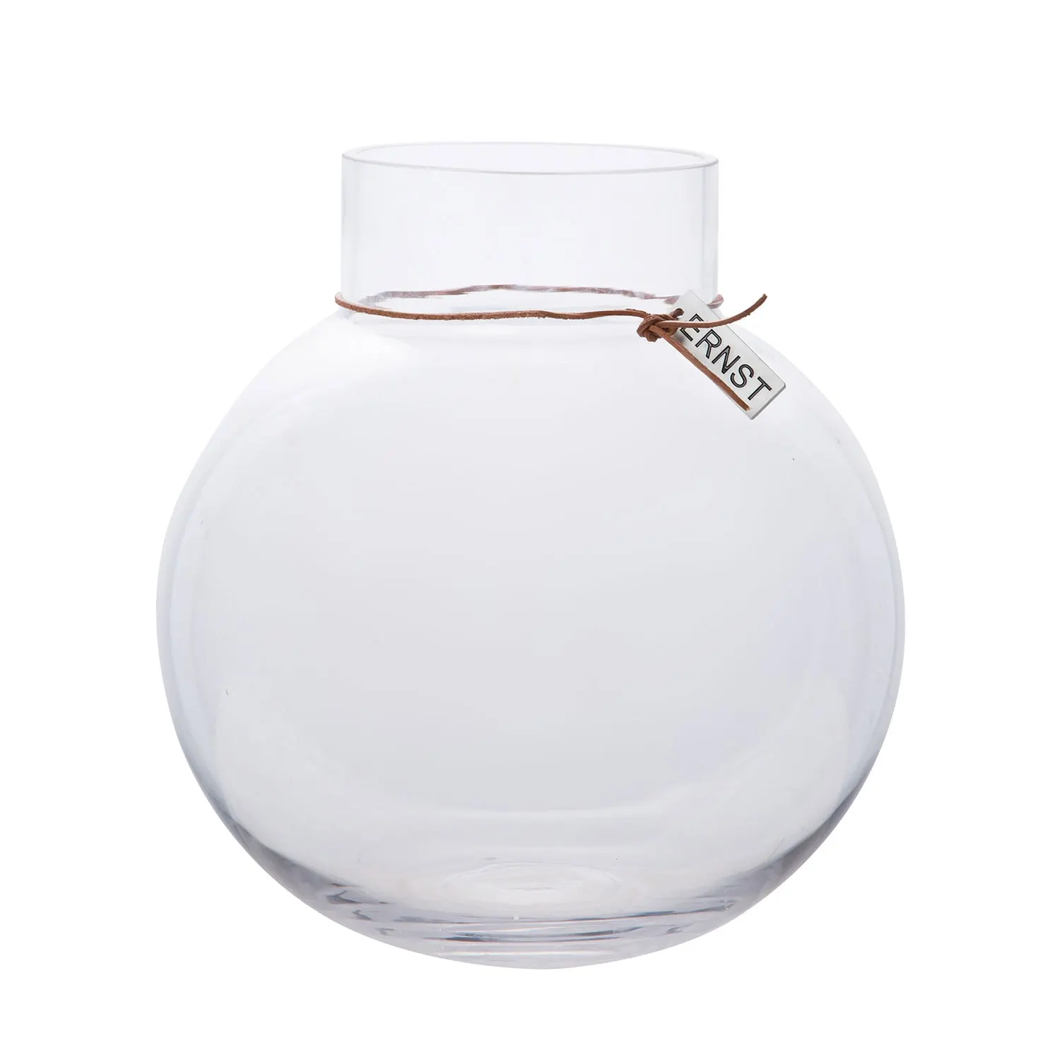 Ernst glass vase has a leather strap with an Ernst logo that gives a rustic feeling. The vase has a simple design and a Scandinavian expression that make the vase look good in every home.