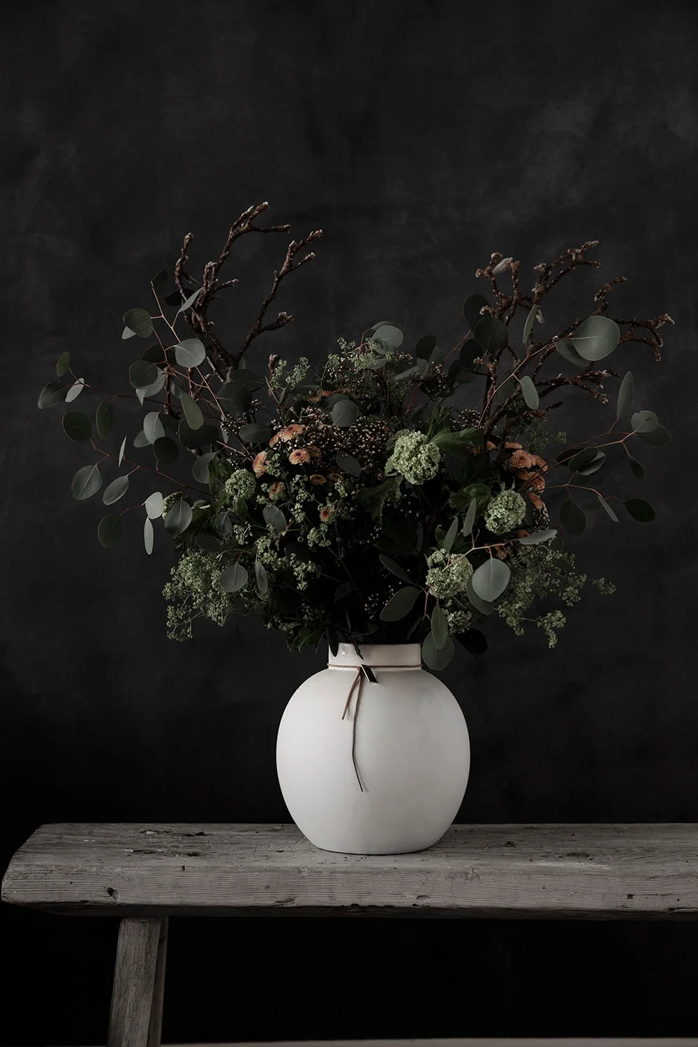 Stoneware Vase from Ernst Kirchsteiger. Fresh cut flowers creates life and joy in every home. This stoneware vase opens up endless possibilities for creating beautiful flower arrangements. The vase has a leather strap tied around that gives an elegant and vibrant expression. The vase is available in three sizes and four colours.