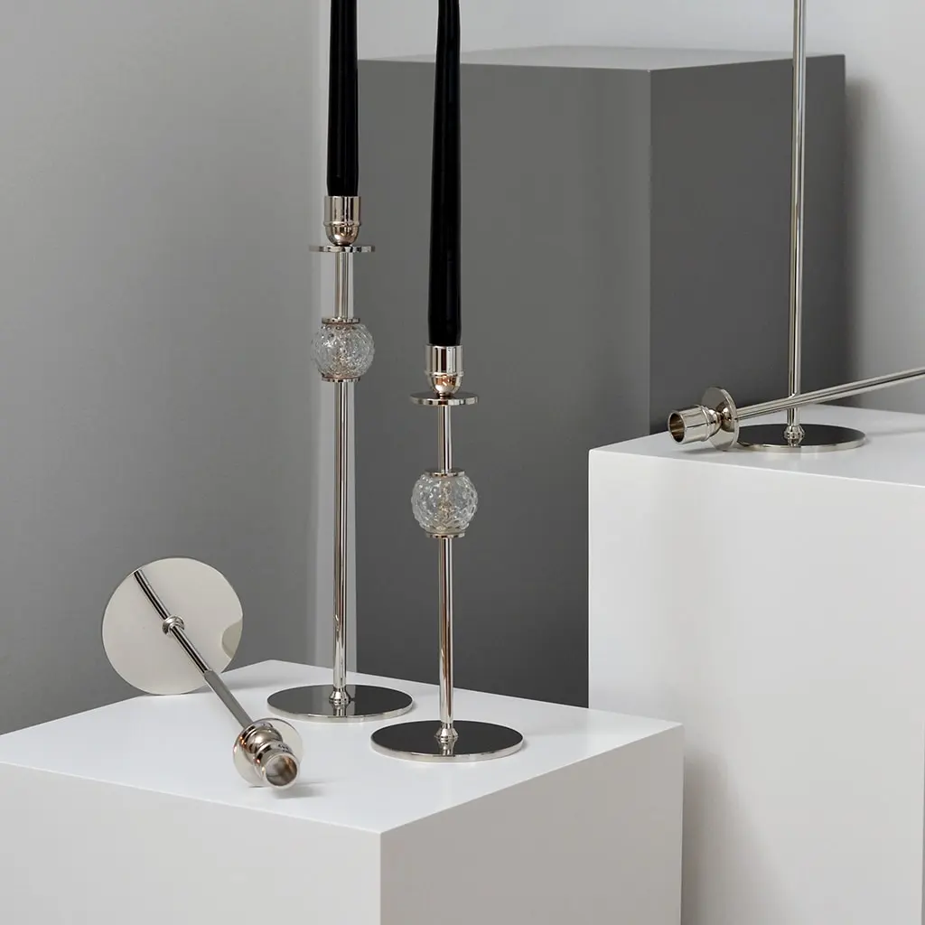 Elegant candlestick handmade of nickel-plated solid brass. Decorated with a beautiful glass ball. Hilke is luxurious Swedish design with its roots in Italy – “La Luna” is Italian for the moon.