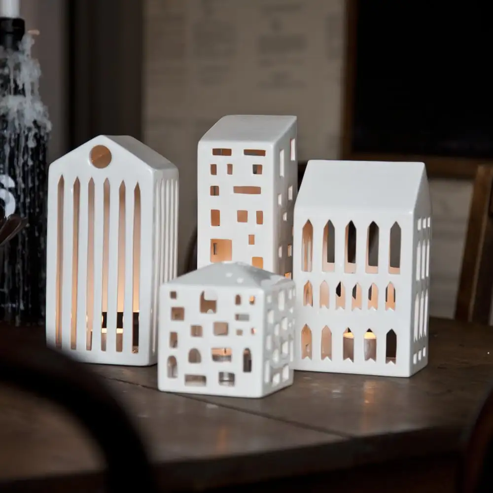 Ljuslyka inspired by modern high-rise buildings. The house has small handcrafted windows that spread beautiful silhouettes and oblong shadows. The votive is included in the Urbania-series with more amazing candle holders. Place this white candle holder on a sideboard by itself, or with more candle holders from Urbania.