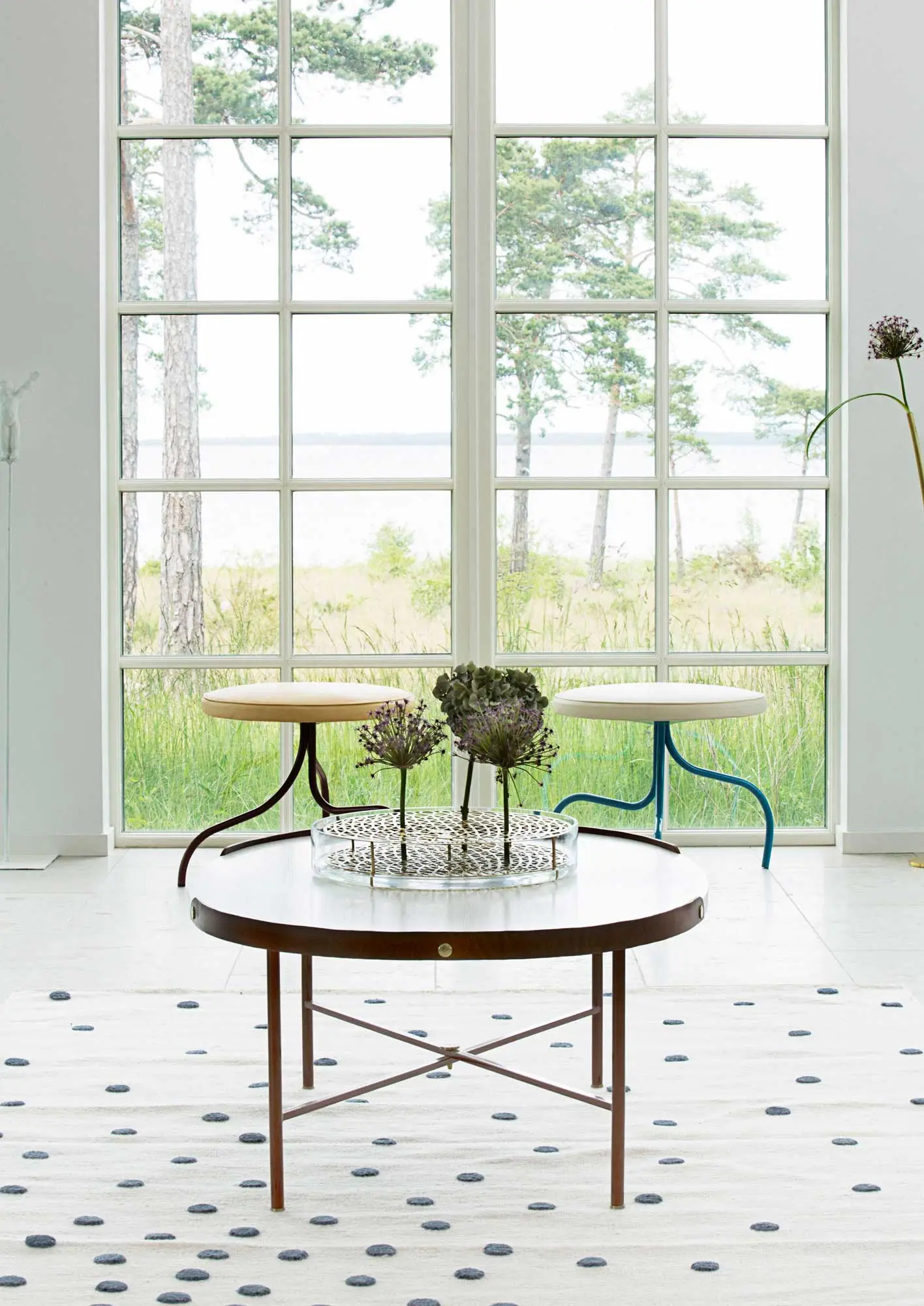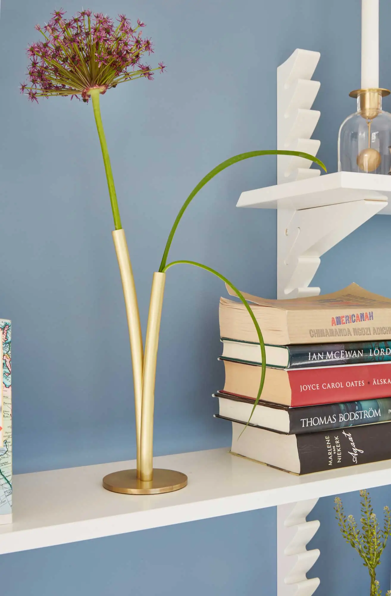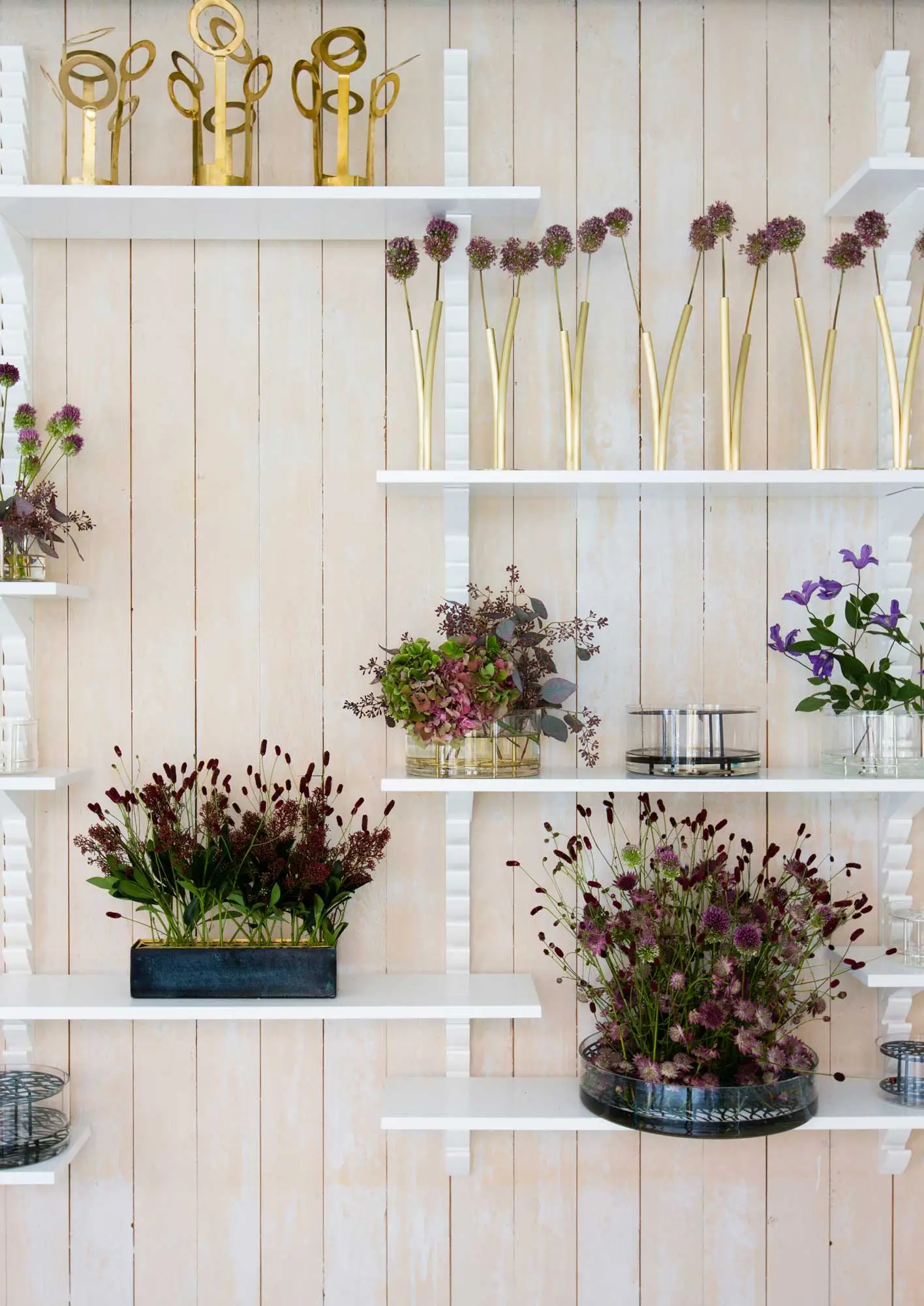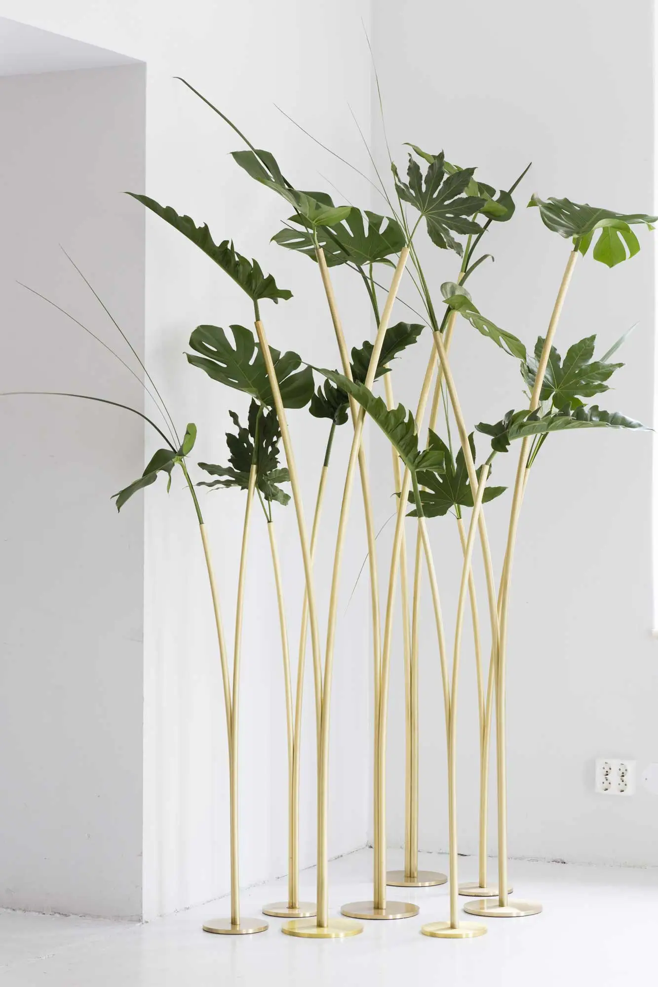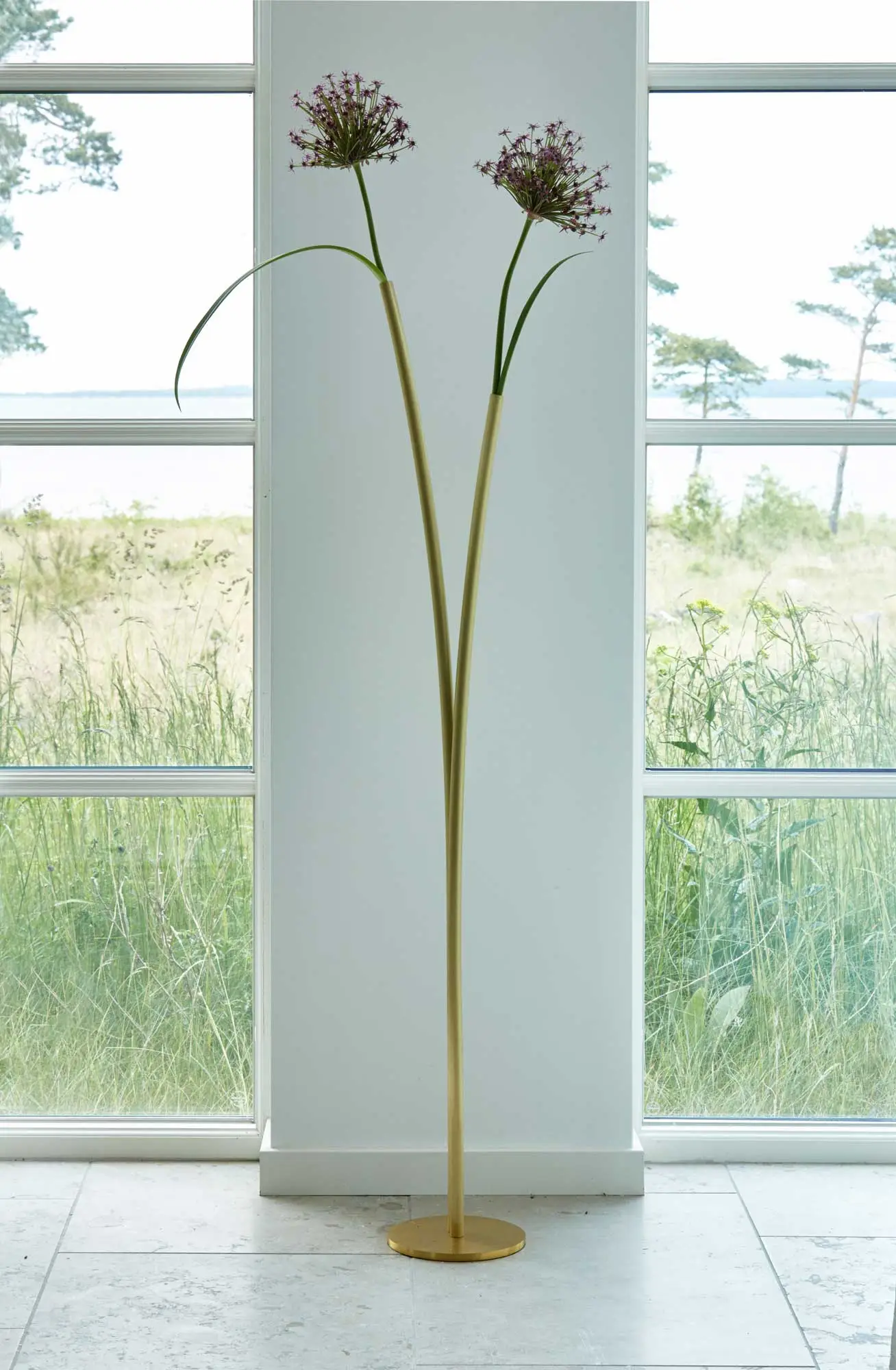 Skott is available in three heights – one for the table and the two intended as solitaires for free positioning on the floor. The vases are made of solid brass with a cylinder in silicone to hold water. The surface is treated with varnish to avoid a lot of polishing.