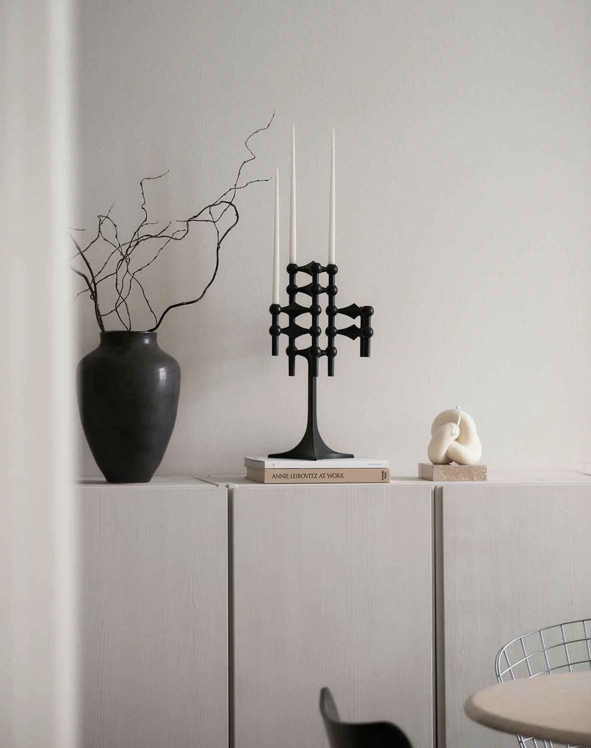 Nagel Candlestick from Stoff is a reproduction of Hans Nagel’s classic modular candlesticks from 1965, designed by Werner Stoff. Each candlestick is a module that can be combined with other modules into different shapes and heights. Create your own unique Nagel Candleholder with different modules and accessories such as the bowl and vase.